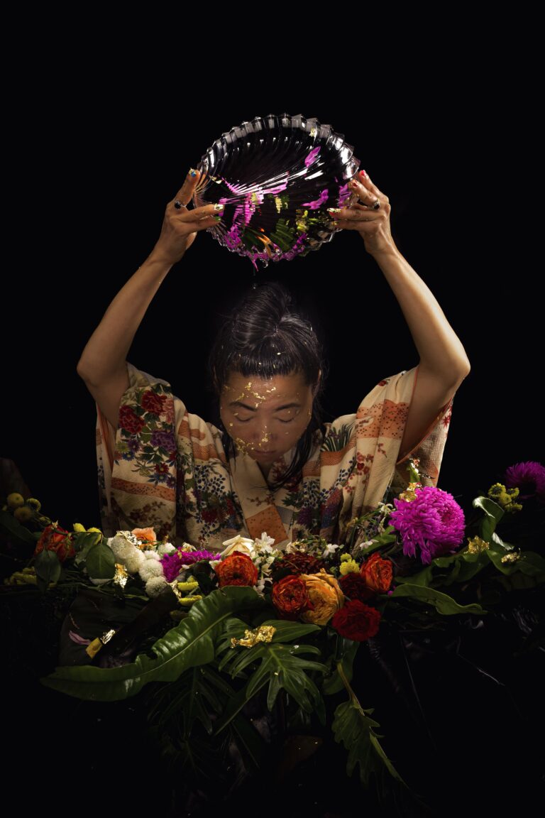 Inspired by classical Japanese theatre, Noh 能, as well as Hanakatoba 花言葉, (the Japanese language of flowers), the Hagoromo (Full Flower Moon) series explores the artist’s Japanese—Australian cultural identity, delving into uncomfortable spaces of grief, separation, longing, and loss. This work is a photographic series of six images that retell the famous Noh play, Hagoromo 羽衣 (The Feather Mantle). The artist is surrounded by chrysanthemums, traditionally associated with death, and her kimono is worn right over left, a style reserved only for the dead—a deep taboo in Japanese culture.