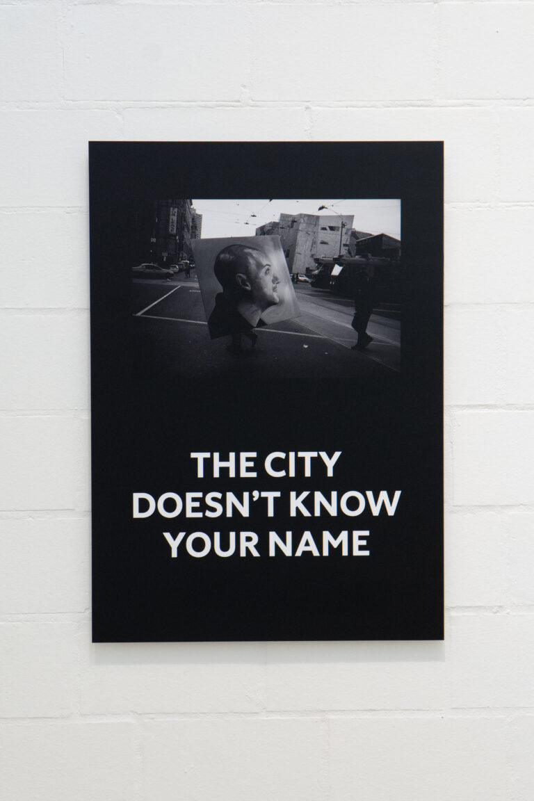 At the height of the COVID19 lockdowns, West Australian visual artist Sam Bloor and Melbourne-based photographer Jesse Marlow found a creative connection across closed borders. The series began with a simple exchange: Marlow’s photographs sent across the country, Bloor’s words written in response. Installed as paste-up posters in their respective cities, the works appeared unannounced in public space. Rooted in a shared attentiveness to the street and its textures, both artists work with the visual language of cities: the unnoticed, the residual, the poetic potential of public life. Marlow’s photographs, captured with clarity and restraint. Bloor’s short-form text works read like aphorisms or fragments of overheard thoughts. Together, they offer a space to pause, notice, think and feel. The city doesn’t know your name (2025), from the series Street posters (2020–2025) is shown for the first time large scale.